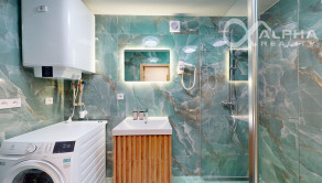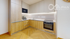 -kúpeľňa: kvalitný dizajnový kúpeľnový nábytok, vyhrievané zrkadlo s ukazovateľom teploty a času, automatická práčka, fén, inovatívna moderná toaleta s integrovanými funkciami,