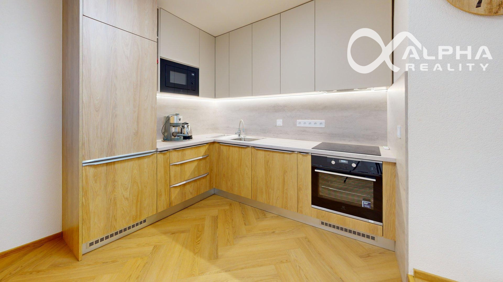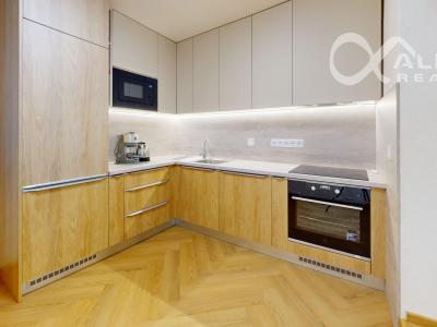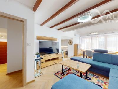 -zariadenie bytu: kuchynská linka so vstavanými spotrebičmi ELECTROLUX (indukčná varná doska, mikrovlnná rúra, umývačka riadu, chladnička s mrazničkou, odsávač pár), dubový jedálenský stôl so stoličkami, rozkladacia pohovka, sektorový nábytok z masívu, dubový konferenčný stolík, elektrický krb, TV SAMSUNG s predĺženou zárukou, manželská posteľ z masívu s nočnými stolíkmi, kreslá, stolík - všetko nové a nepoužívané,