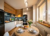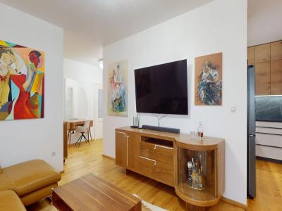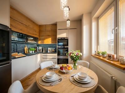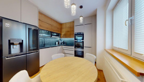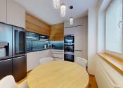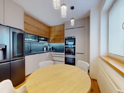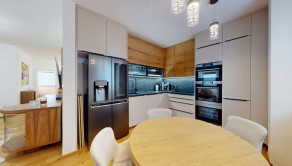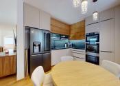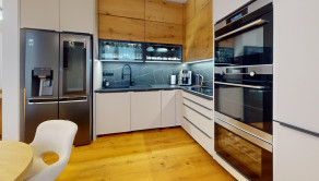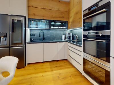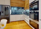 -vybavenie kuchyne: kuchynská linka DANKÜCHEN so vstavanými spotrebičmi: indukčná varná doska BORA s integrovaným odsávaním pár, AEG teplovzdušná rúra, AEG mikrovlná rúra, AEG vinotéka, umývačka riadu, kameninový drez, inteligentná americká LG chladnička s mrazničkou,